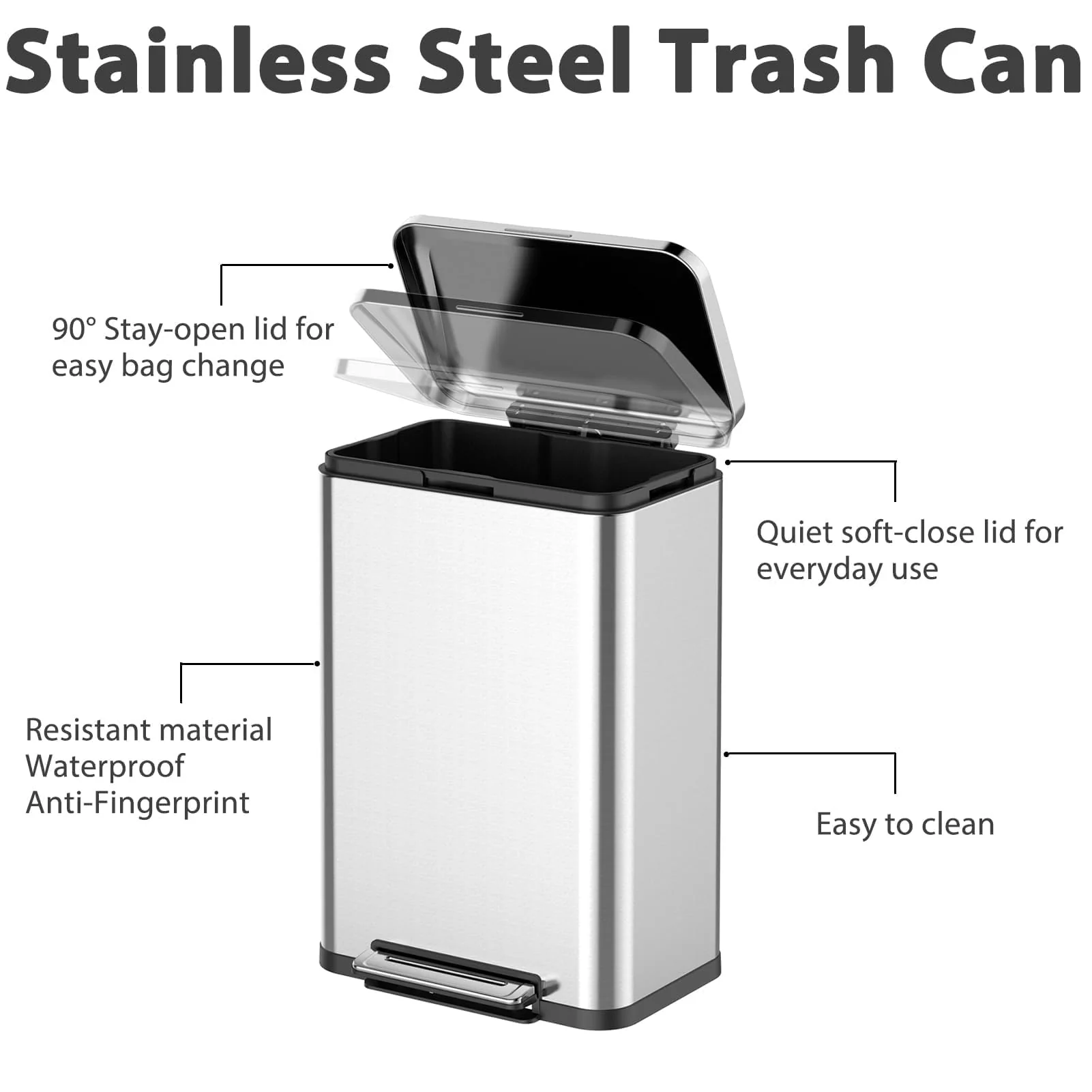 - Modern and Stylish: Made with elegant fingerprint-proof and smudge-resistant stainless steel, these trash cans are not only functional but also visually appealing. They complement any kitchen or office decor and are easy to clean, maintaining their sleek appearance.