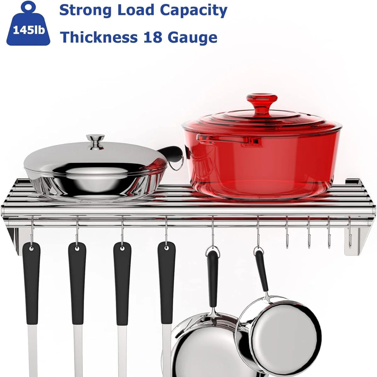 Garvee 12" x 36" Stainless Steel Shelf Pot Rack NSF Certified 165lb Metal Wall Shelf with 10 S Removable Storage Hooks for Kitchen Storage & Organization Durable Pot Holder