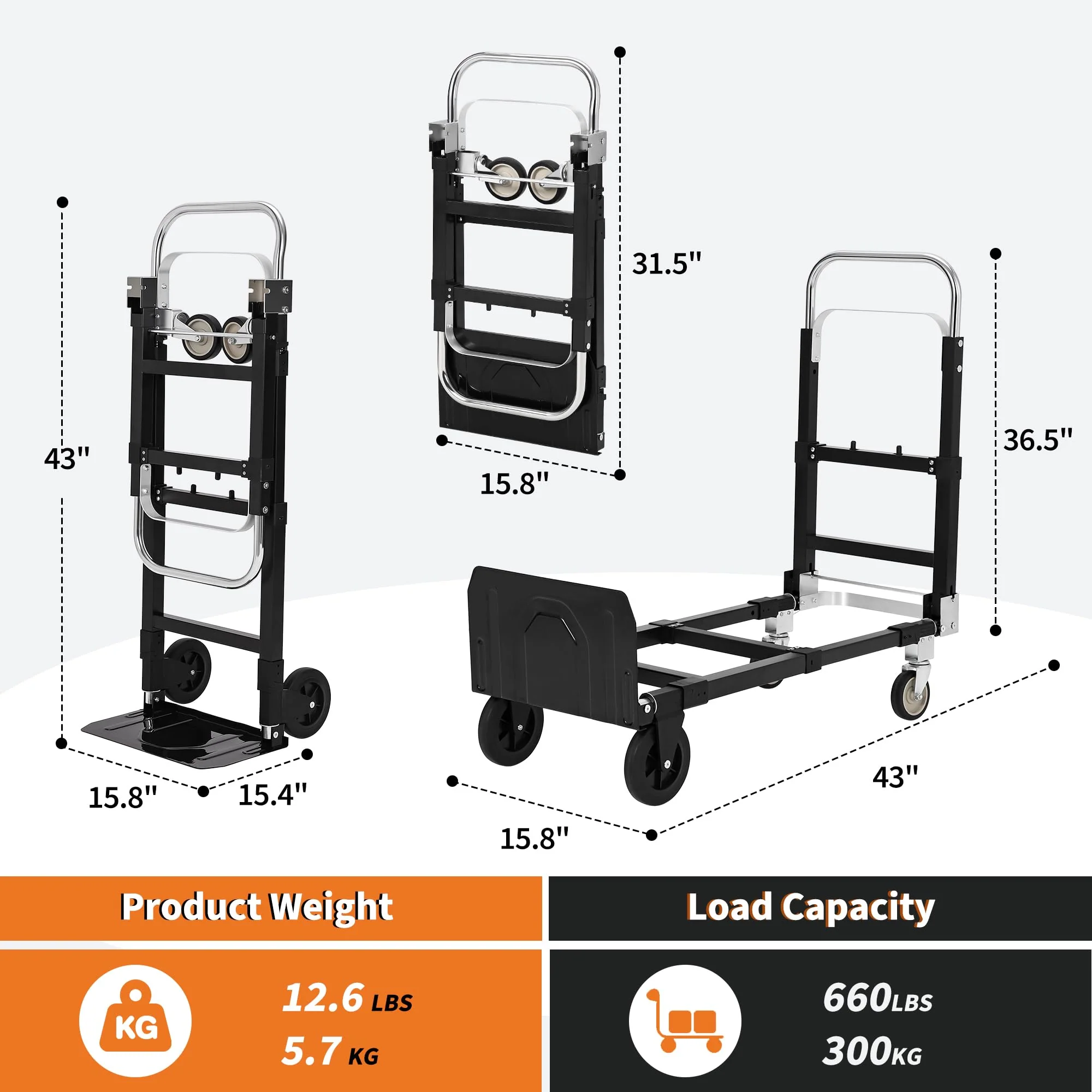 - Exceptional Capacity: Supports up to 220 lbs in 2-wheel mode and up to 660 lbs in 4-wheel flatbed mode (selected models), making it ideal for warehouses, workshops, and heavy-duty tasks.