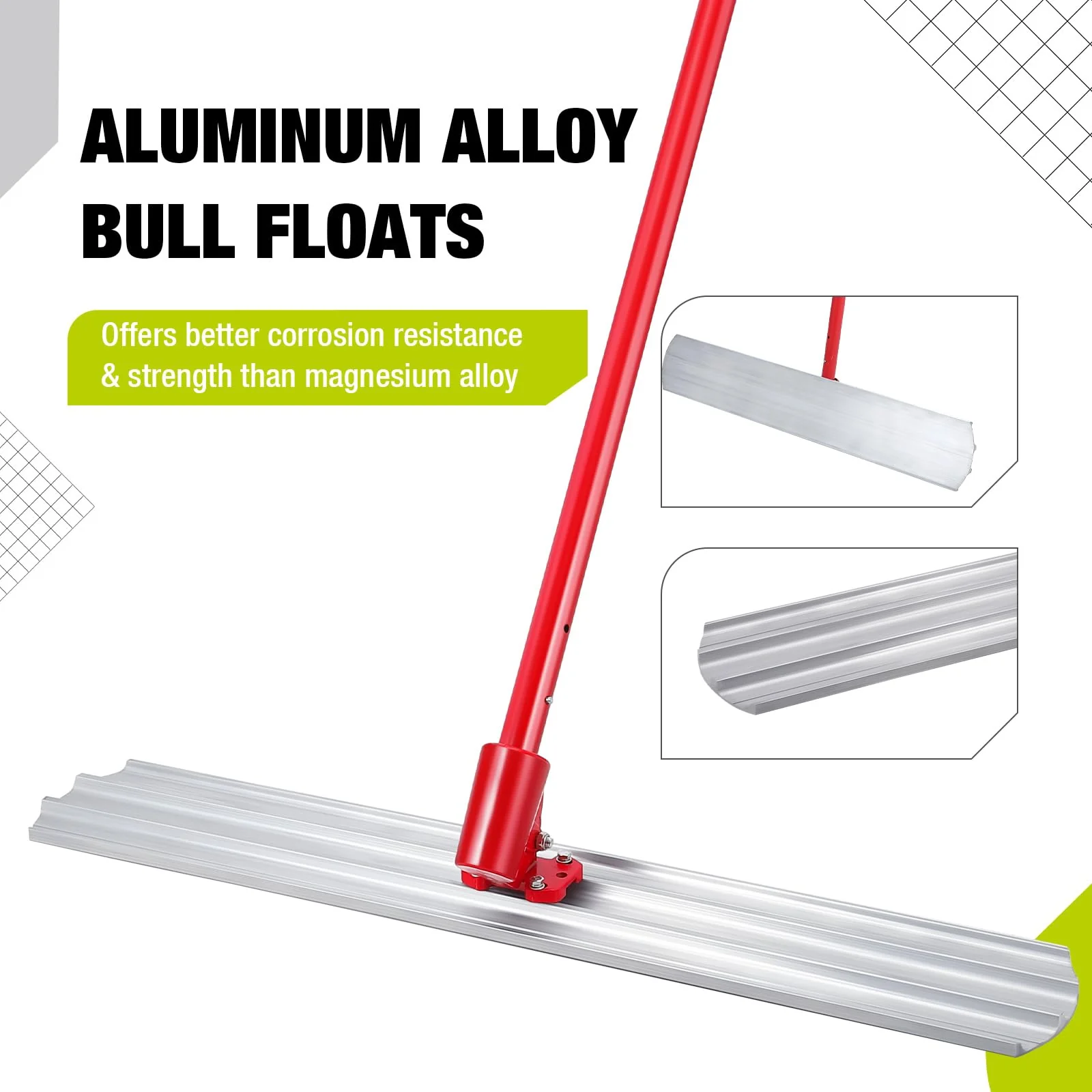 - ALUMINUM MAGNESIUM BULL FLOAT SET:The aluminum-magnesium Bull Float Set includes everything you need for concrete finishing: a magnesium float blade, a float bracket, and 4*47-inch Swaged Button Handles. The combination of these tools ensures smooth and efficient concrete leveling, even on large surfaces.