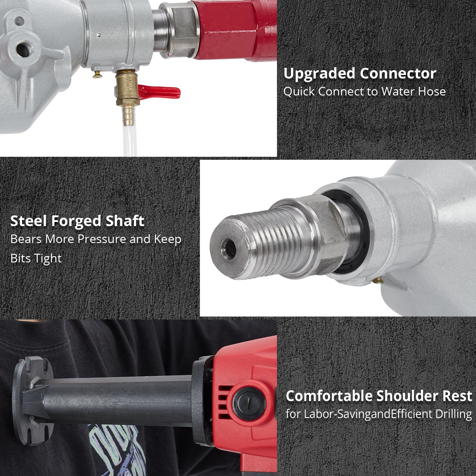 - Effortless Drilling: Our handheld drilling rig has a rustproof steel forged output shaft to bear more pressure, an upgraded one-touch water pipe connector for a stable water supply, and a shoulder rest for you to easily carry the core drill rig on your shoulder and reduce friction caused by drilling.