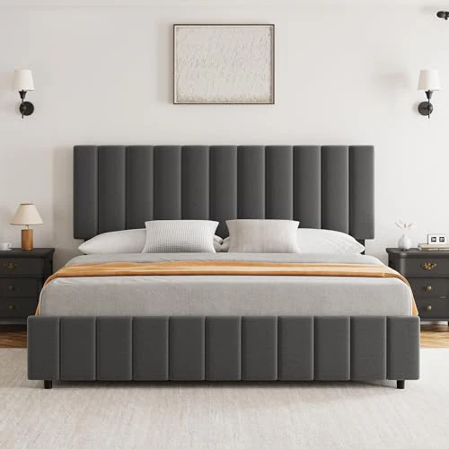 Garvee Grey Full Linen Upholstered Bed Frame with 4 Storage Drawers, Adjustable Headboard, Sturdy Wooden Slats, No Box Spring Required, Easy Assembly