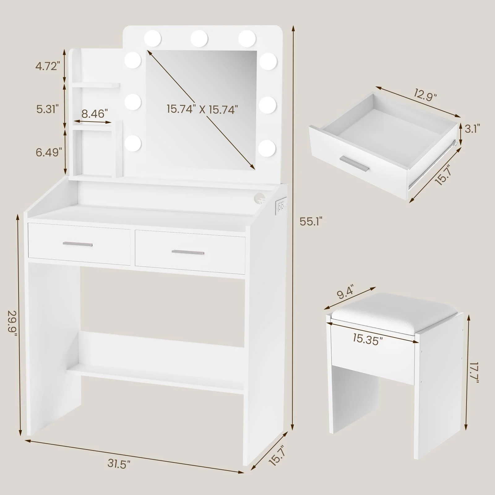 | Included Components | Vanity desk, mirror, cushioned stool |