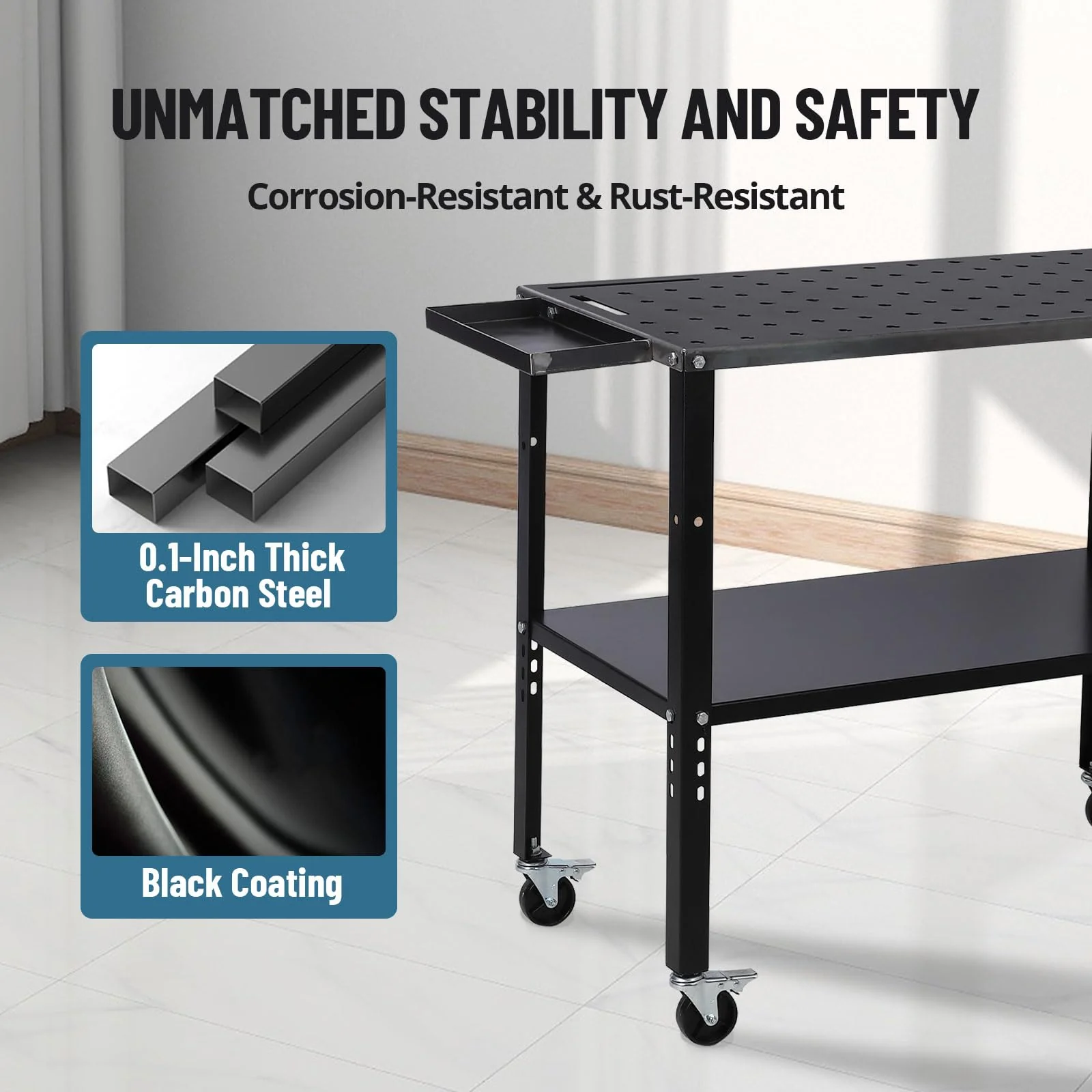 With a remarkable load-bearing capacity of 1200lbs, this steel welding workbench table can handle heavy-duty projects with ease. The sturdy construction ensures stability and safety while you work.